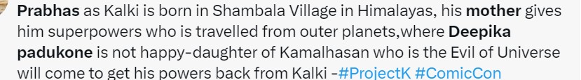 ट्रेलर देखने के बाद कुछ का ये भी मानना है कि दीपिका, प्रभास (Prabhas) की मां के रोल में हो सकती हैं। प्रभास के कैरेक्टर का नाम भैरव है। ट्रेलर के एक सीन में दीपिका को 'सुम-80' के नाम से दिखाया गया है।