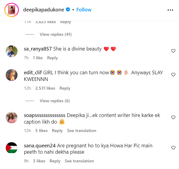 आपको बता दें कि दीपिका पादुकोण की प्रेग्नेंसी की न्यूज जब से सामने आई है। एक्ट्रेस ने लगभग सभी फोटोज में साइड पोज दिए हुए हैं। उनकी एक भी फ्रंट फोटो नहीं है। यही बात यूजर्स को रास नहीं आ रही है। एक यूजर ने कमेंट करते हुए लिखा, "क्या अब ये अपना पोज कभी चेंज नहीं करेंगी, अब यही हम लोग जानना चाहते हैं"।