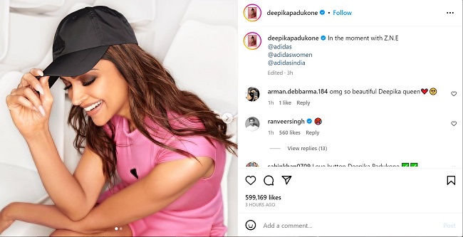 इस बीच, दीपिका पादुकोण के पति और अभिनेता रणवीर सिंह ने भी फोटो पर प्रतिक्रिया दी है। उन्होंने एक दिलचस्प इमोजी शेयर की है। तस्वीरों में दीपिका पिंक टॉप के साथ मैचिंग शॉर्ट्स पहन रखी है। उन्होंने काली टोपी, सफेद स्नीकर्स और मोजे के साथ अपने एथलिट लुक में चार चांद लगा दिए है। उनके बाल खुले हुए है। उन्होंने स्मोकी आई मेकअप कर रखा है। वह काफी ग्लैमरस लुक में है।