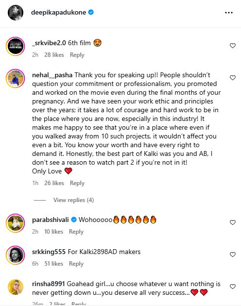 दीपिका पादुकोण के इस पोस्ट पर कमेंट करते हुए रणवीर सिंह ने लिखा, "बेस्टेस्ट बेस्टी"। फैंस ने फेवरेट एक्ट्रेस का हौसला बढ़ाते हुए लिखा, "भगवान करे आपको हमेशा बेस्ट मिले, कोई भी आपको नीचे नहीं गिरा सके"। दूसरे यूजर ने लिखा, "ग्रेट रिप्लाई, जो लोग जानते हैं उन्हें पता है कि दीपिका क्या कहना चाहती हैं"।