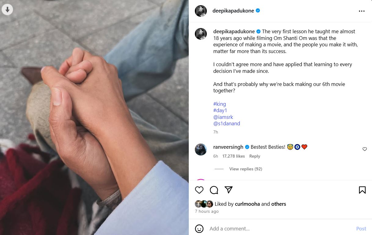 दीपिका पादुकोण ने आधिकारिक इंस्टाग्राम अकाउंट पर शाह रुख खान संग किंग की शूटिंग स्टार्ट करने की घोषणा की। फोटो में उन्होंने किंग खान का हाथ पकड़ा हुआ है। हालांकि, इसके साथ जो उन्होंने कैप्शन लिखा है, वह लोगों का ध्यान खींच रहा है। सोशल मीडिया यूजर्स को ये लग रहा है कि इस पोस्ट के जरिए दीपिका पादुकोण ने संदीप रेड्डी वांगा और कल्कि 2 के मेकर्स को इनडायरेक्टली ताना मारा है।