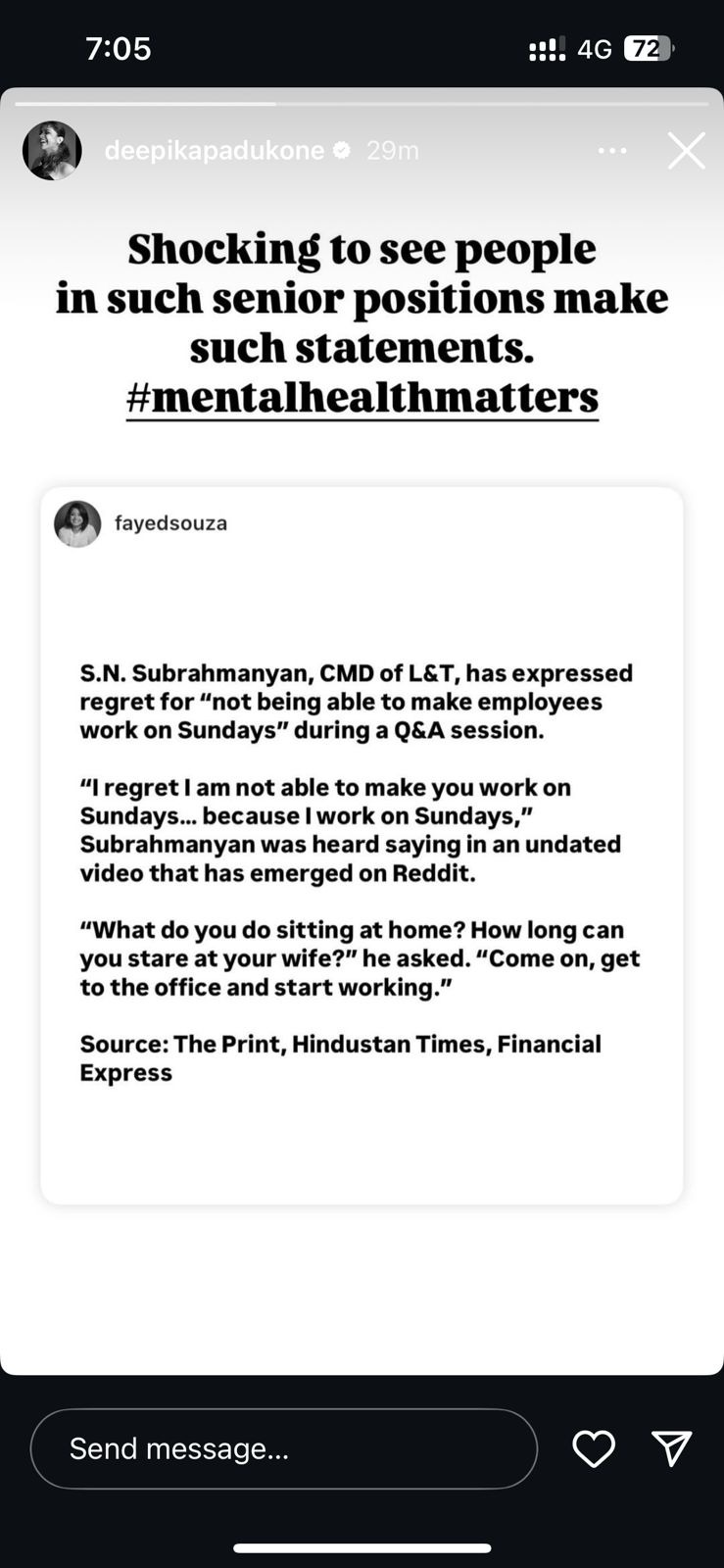 बॉलीवुड एक्ट्रेस दीपिका पादुकोण ने लार्सन एंड टर्बो के चेयरमैन एनएस सुब्रह्मण्यन के बयान पर आपत्ति जताई है। दरअसल उन्होंने एक बयान दिया था कि कर्मचारियों को रविवार को भी काम करवाना चाहिए क्योंकि वो घर पर बैठकर बीवी का मुंह देखकर क्या करेंगे। सुब्रह्मण्यन के अनुसार लोगों को 90 घंटे काम करना चाहिए। अभिनेत्री दीपिका ने इस पर नाराजगी जताई है।