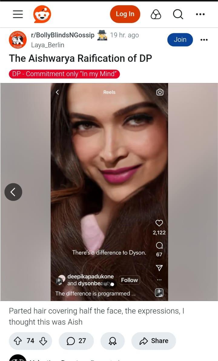 रेडिट पर एक पोस्ट वायरल हो रहा है जिसका टाइटल है,"दीपिका का ऐश्वर्या रायफिकेशन"। दीपिका और ऐश्वर्या दोनों ही अपनी खूबसूरती और अभिनय के लिए फैंस के बीच काफी लोकप्रिय हैं। कुछ प्रशंसक यह भी कह रहे हैं कि दीपिका ने अपने नए वीडियो में उन्हें ऐश्वर्या की याद दिला दी।