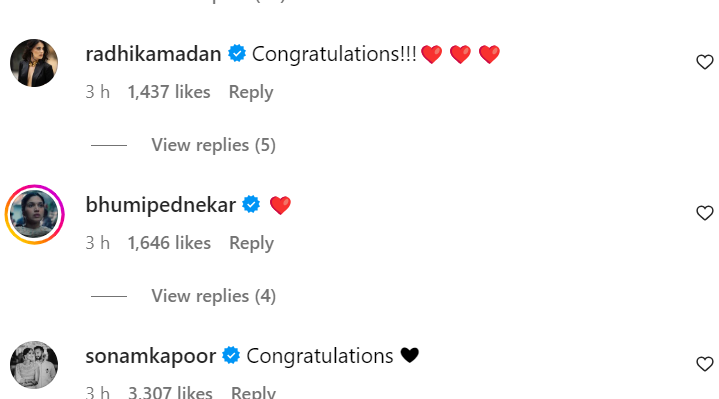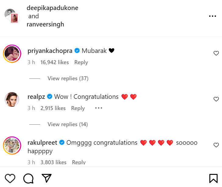 दीपिका और रणवीर के इस पोस्ट पर ग्लोबल आइकॉन प्रियंका चोपड़ा ने कमेंट करते हुए लिखा, 'मुबारक'। प्रीति जिंटा ने लिखा, वाओ, बधाई'। न्यूली वेड रकुल प्रीत सिंह ने लिखा, ओएमजी... बधाई, बहुत खुश हूं'। माधुरी दीक्षित ने भी बधाई दी। सोनाक्षी सिन्हा ने लिखा, 'तुम्हारा अब तक का बेस्ट प्रोडक्शन उत्पादन, आप दोनों के लिए बहुत खुश हूं... बधाई हो'।