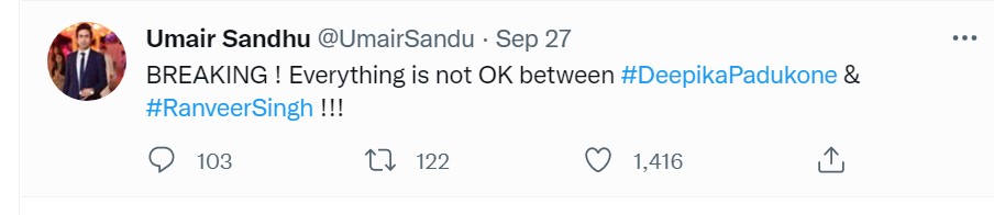 दरअसल, दीपिका पादुकोण और रणवीर सिंह को लेकर इंटरनेट पर ऐसी खबरें फैली हैं कि दोनों के बीच सब कुछ ठीक नहीं है। हमेशा अपने प्यार का गुणगान करने वाले इस कपल के रास्ते अलग हो सकते हैं। ऐसी खबरों से बाजार तब गर्माया जब एक यूजर ने ट्वीट किया, 'ब्रेकिंग! दीपिका पादुकोण और रणवीर सिंह के बीच सब कुछ ठीक नहीं है।' यहीं से रणवीर सिंह और दीपिका पादुकोण के अलग होने की अफवाहों को तूल मिली और देखते ही देखते यह खबर आग की तरह फैल गई। ट्वीट करने वाले का नाम उमेर संधु है। उनकी प्रोफाइल के मुताबिक, उमेर टॉप साउथ और हिंदी ओवरसीस फिल्म क्रिटिक हैं।
