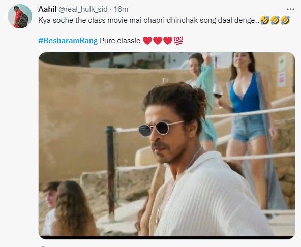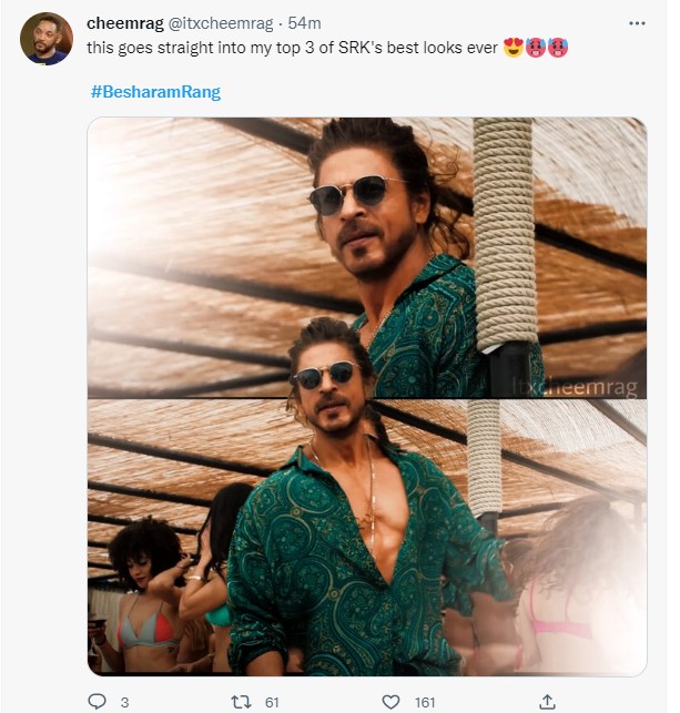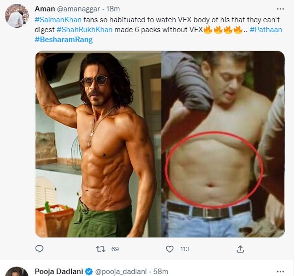 एक यूजर ने तो सलमान खान से शाह रुख खान की तुलना कर दी। उसने लिखा, '#SalmanKhan के फैंस को उनकी वीएफएक्स वाली बॉडी देखने की इतनी आदत पड़ गई है कि वह #ShahRukhKhan की बिना वीएफएक्स वाली बॉडी को डायजेस्ट नहीं कर पा रहे। #Pathaan #BesharamRang'