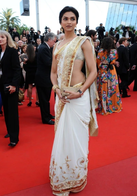 जब दीपिका पादुकोण ने अपना ग्लोबल इवेंट पर डेब्यू किया था, उस दौरान भी एक्ट्रेस ने साड़ी ही चुनी। कान्स के रेड कारपेट पर वह पहली बार व्हाइट रंग की साड़ी के साथ शिमरी ब्लाउज में दिखाई दी थीं, जिसमें गोल्डन रंग का बॉर्डर था। इस इवेंट में दीपिका पादुकोण बिंदी और बन में बला की खूबसूरत लग रही थीं।