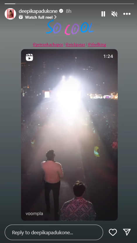 दीपिका पादुकोण (Deepika Padukone) ने अपने इंस्टा स्टोरी में प्रियंका चोपड़ा के पति निक जोनस का सिंगर स्टेज परफॉर्मेंस वाला वीडियो शेयर किया है। इसी के साथ उन्होंने निक, प्रियंका और किंग को टैग भी किया और कैप्शन में लिखा 'सो कूल'।