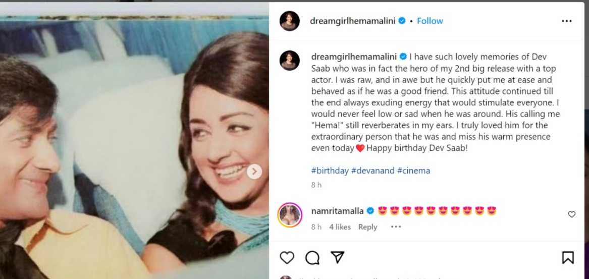 इस तरह से हेमा मालिनी ने देव आनंद की 101वीं जयंती पर उनके लिए स्पेशल पोस्ट किया है। सोशल मीडिया पर एक्ट्रेस के इस पोस्ट को खूब पसंद किया जा रहा है।