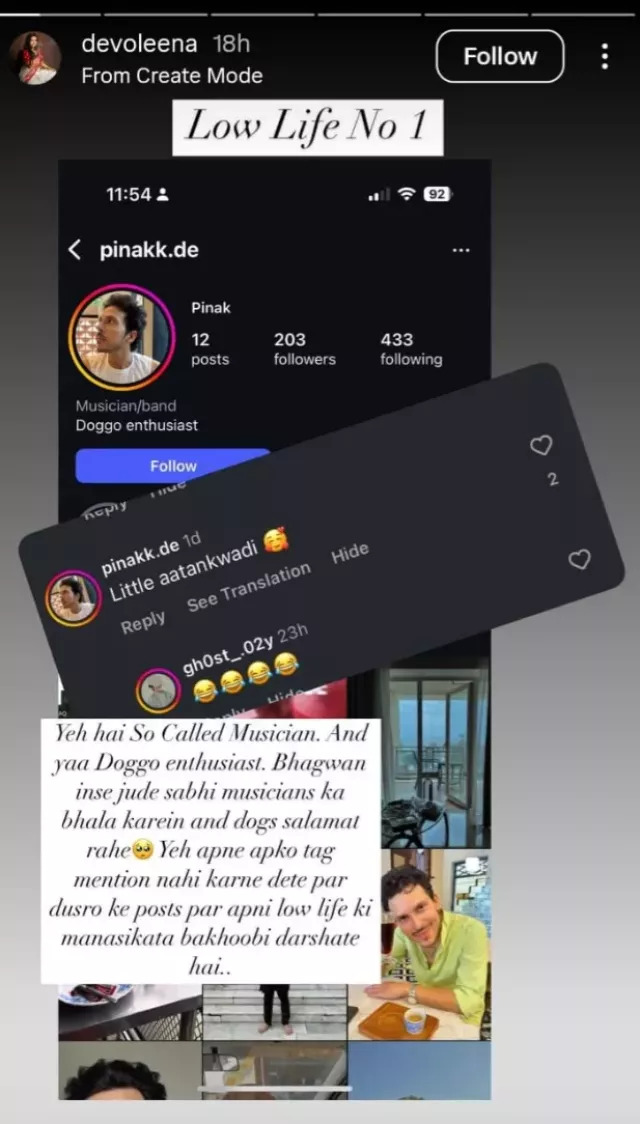 एक यूजर ने तो कमेंट में हद करते हुए लिखा- छोटा आतंकवादी। इस पर देवोलीना ने लिखा, "ये हैं म्यूजिशियन, भगवान इनसे जुड़े म्यूजिशियन का भला करे। ये अपने आप को टैग या मेंशन नहीं करते, लेकिन अपनी लो लाइफ की मानसिकता बखूबी दर्शाते हैं।