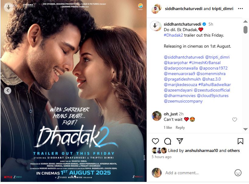 Dhadak 2: पर्दे पर आग लगा देगी तृप्ति डिमरी और सिद्धांत की जोड़ी, इस पोस्ट को देख यूजर्स बोले 'ब्लॉकबस्टर'