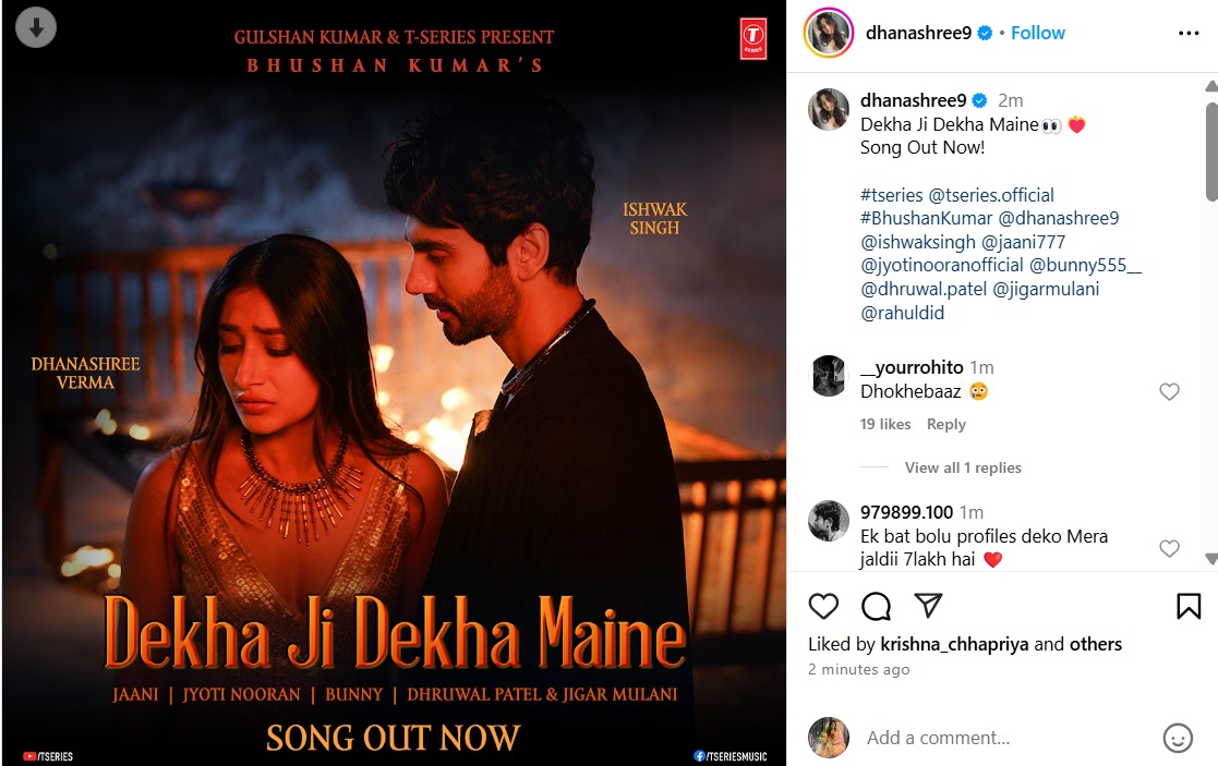 दरअसल धनश्री वर्मा का नया गाना रिलीज हो गया है, जिसके बोल देखा जी देखा मैंने हैं। ये एक सैड सॉन्ग है और इसमें उनके साथ एक्टर इशाक सिंह नजर आ रहे हैं। इस गाने के पोस्टर में धनश्री रोतीं हुईं दिखाई दे रही हैं। ऐसे में तलाक के बाद उनका ये पहला पोस्ट सिर्फ और सिर्फ लेटेस्ट सॉन्ग की रिलीज को लेकर है न कि चहल अलग होने के गम में।