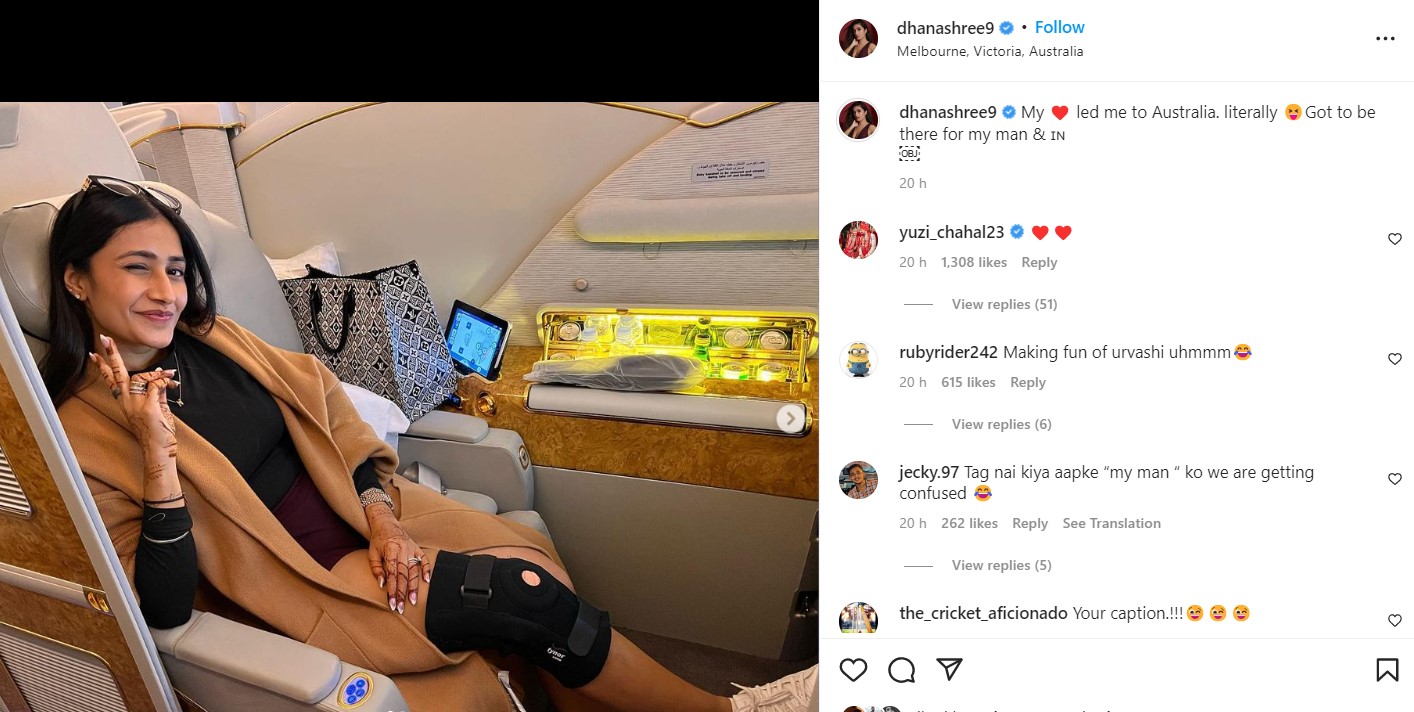 युजवेंद्र चहल की वाइफ धनाश्री एक कोरियोग्राफर हैं और सोशल मीडिया पर काफी एक्टिव रहती हैं। वह अक्सर फैंस के साथ अपनी अपडेट शेयर करती हैं। ऑस्ट्रेलिया ट्रिप के दौरान भी उन्होंने फ्लाइट से अपनी एक तस्वीर शेयर की, जिसमें वह सीट पर बैठी हुई नजर आ रही हैं, साथ ही उनके घुटने पर लगा हुआ बैंड भी दिख रहा है, क्योंकि हाल ही में उन्होंने घुटने की सर्जरी कराई है। पोस्ट के कैप्शन में धनश्री ने लिखा, "मेरा प्यार मुझे ऑस्ट्रेलिया ले आया। मुझे अपने हसबैंड को सपोर्ट करने के लिए यहां होना था।" बस इसी कैप्शन ने सोशल मीडिया पर ट्रोलर्स को एक बार फिर एक्टिव कर दिया क्योंकि कुछ दिनों पहले उर्वशी रौतेला ने भी प्लेन से अपनी तस्वीर शेयर की थी और हार्ट इमोजी बनाते हुए कैप्शन में लिखा था, "मेरा प्यार मुझे ऑस्ट्रेलिया ले आया।", जिसे लोगों ने ऋषभ पंत के लिए बताया था।