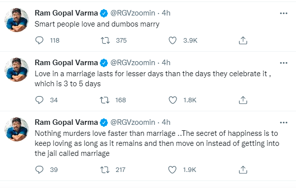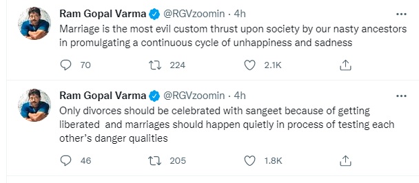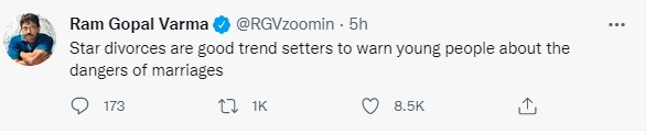 उन्होंने बिना किसी का नाम लिए सोशल मीडिया पर शादी और तलाक को लेकर एक के बाद एक कई ट्वीट किए हैं। अपने ट्वीट्स में राम गोपाल वर्मा ने शादी को खराब बताया है। साथ ही कहा है कि स्मार्ट लोग प्यार करते हैं और मुर्ख शादी करते हैं। राम गोपाल वर्मा ने अपने पहले ट्वीट में लिखा, 'युवाओं को शादी के खतरों के बारे में चेतावनी देने के लिए 'स्टार तलाक' अच्छे ट्रेंडसेटर हैं।'