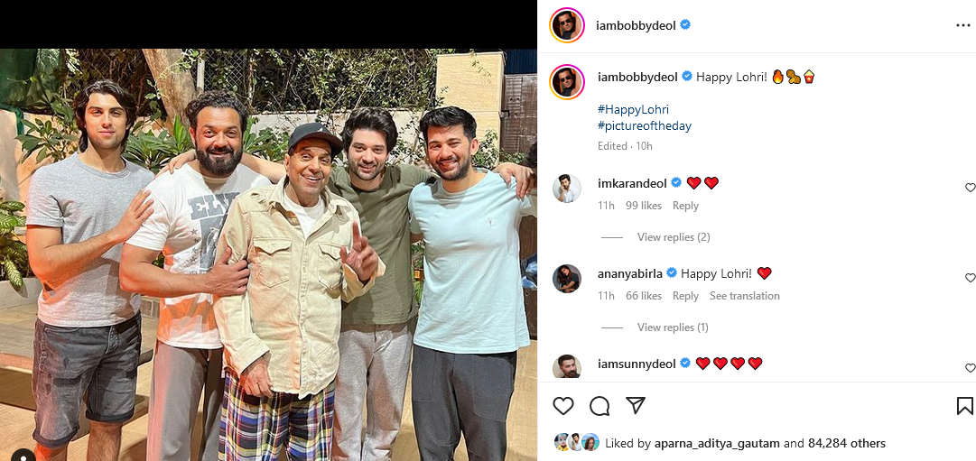 धर्मेंद्र के बेटे और एक्टर बॉबी देओल ने अपने इंस्टाग्राम हैंडल पर लोहड़ी सेलिब्रेशन की तस्वीर शेयर की है। इस तस्वीर में धर्मेंद्र के साथ बॉबी देओल, उनके बेटे आर्यमन देओल, देओल के बेटे करण देओल और राजवीर देओल सभी एक साथ नजर आ रहे हैं। धर्मेंद्र ने लोहड़ी बेटे और पोतों के साथ मनाई है। इस दौरान सभी काफी खुश नजर आ रहे हैं।