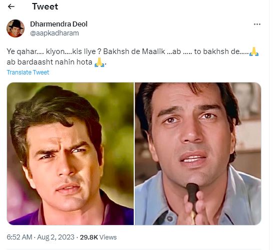 बुधवार को अपने आधिकारिक ट्विटर अकाउंट पर धर्मेंद्र ने अपनी दो पुरानी फोटो शेयर की। ये दोनों फोटोज उनकी किसी फिल्म की मालूम पड़ती हैं। इन दो तस्वीरों को शेयर करते हुए धर्मेंद्र ने कैप्शन में लिखा, "ये कहर..क्यों...किसलिए? बख्श दे मालिक। अब तो बख्श दे, अब बर्दाश्त नहीं होता"।