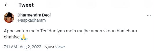 सोशल मीडिया पर उनके इस ट्वीट को कई लोग नूहं हिंसा मामले से जोड़ते हुए दिखाई दे रहे हैं। उनका मानना है कि जिस तरह से हिंसा बढ़ रही है, उसे लेकर धर्मेंद्र ने अपनी चिंता जाहिर की है।