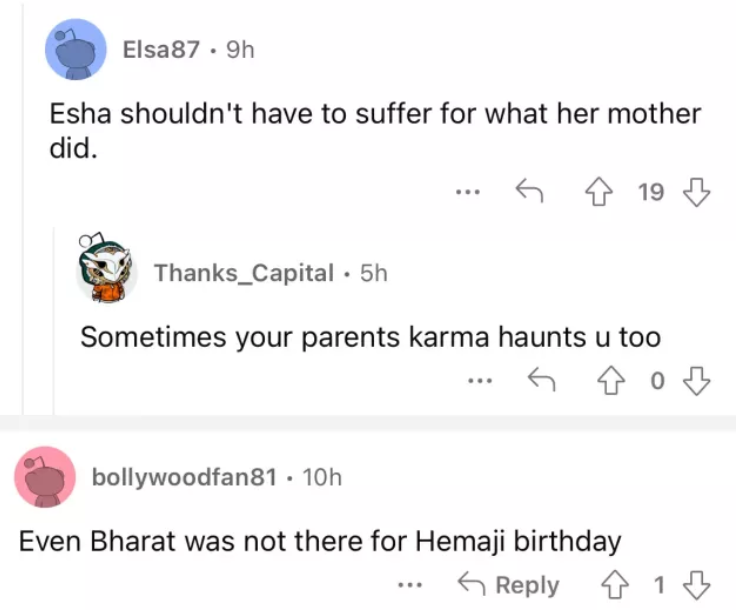 एशा देओल से जुड़ी इस पोस्ट को देखने के बाद यूजर्स अलग-अलग तरह की प्रतिक्रिया जाहिर कर रहे हैं। कुछ यूजर्स इस पोस्ट को महज एक अफवाह बता रहे हैं, तो कई लोग इसे 'कर्मा' तक कह रहे हैं। एक यूजर ने लिखा, "भरत हेमा जी के बर्थडे में भी शामिल नहीं हुए थे"।