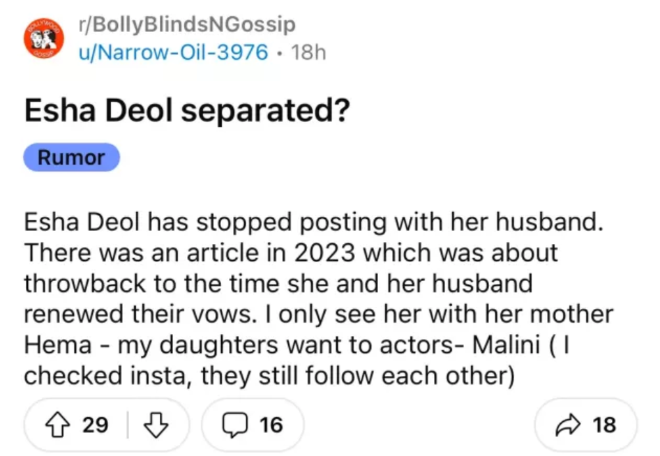 हाल ही में रेडिट पर एक पोस्ट शेयर किया गया, जिसने एशा देओल के पति भरत तख्तानी से अलग होने की खबरों को हवा दी है।