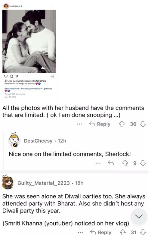 दूसरे यूजर ने लिखा, "वह दिवाली पार्टीज में भी अकेली ही जा रही हैं। वह हमेशा भरत के साथ पार्टीज अटेंड करती थीं। उन्होंने इस साल दिवाली पार्टी भी नहीं रखी"।