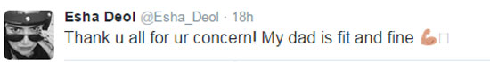 एशा देओल ने भी ट्वीट कर कहा, बिल्कुल ठीक हैं मेरे पिता