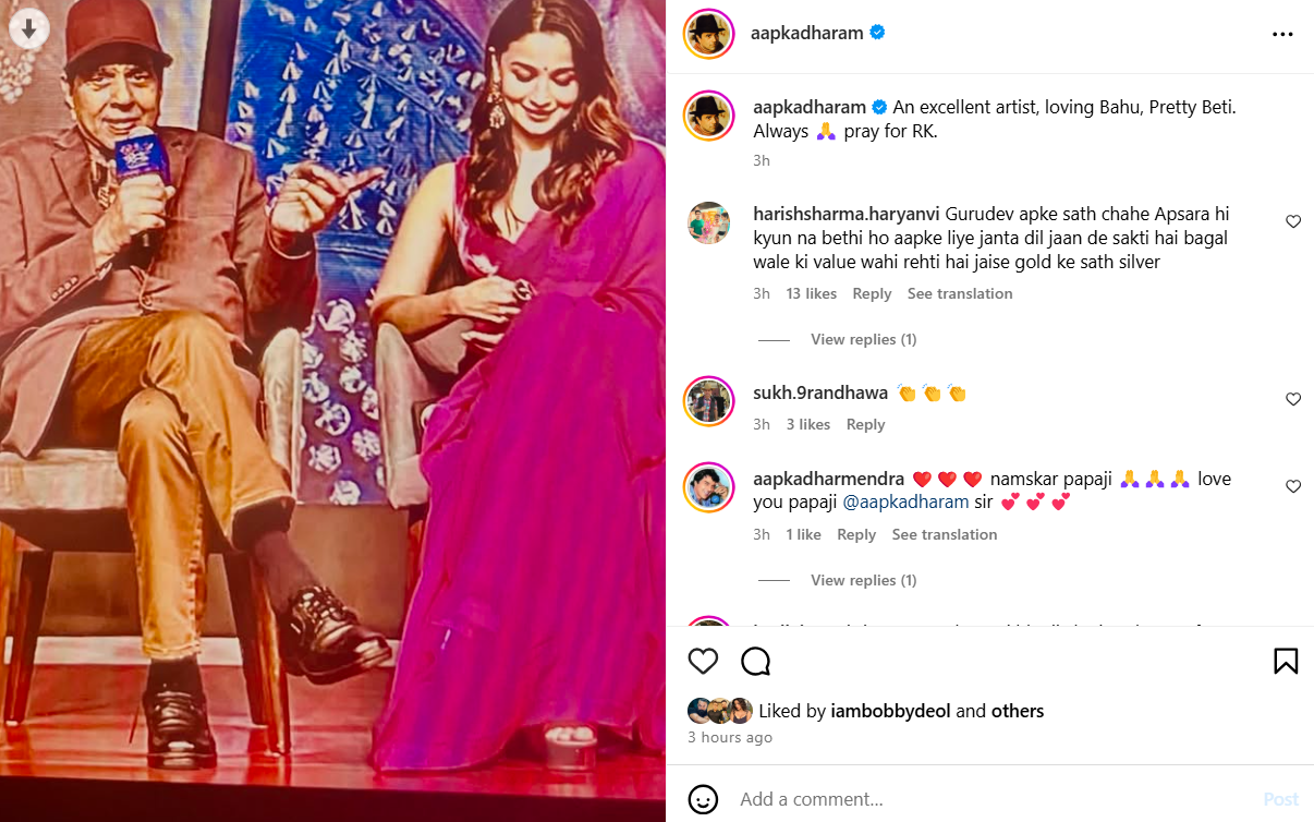 दिग्गज अभिनेता धर्मेंद्र सोशल मीडिया पर अक्सर पोस्ट करके लोगों का दिल जीत लेते हैं। वह इंस्टाग्राम पर आए दिन थ्रो-बैक तस्वीरें शेयर करते रहते हैं। हाल ही में उन्होंने अपनी रॉकी और रानी की प्रेम कहानी की को-स्टार आलिया भट्ट की तारीफ में एक पोस्ट किया। इस पोस्ट में उन्होंने RK के लिए भी बेहद खास बात लिखी है।