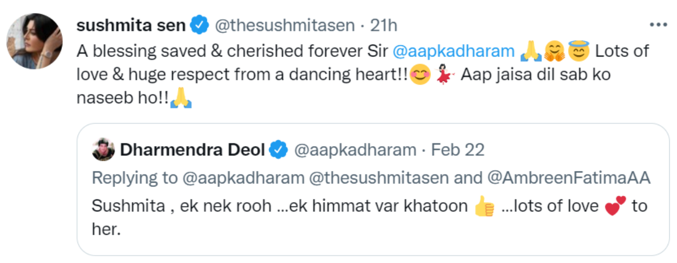 धर्मेंद्र के इस कॉम्पलीमेंट से बाग-बाग सुष्मिता ने जवाब में लिखा- इस आशीर्वाद को सुरक्षित कर लिया और हमेशा इसका आनंद उठाकी रहूंगी सर। झूमते दिल के साथ बहुत सारा प्यार और सम्मान। आप जैसा दिल सबको नसीब हो।
