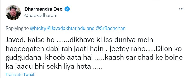जावेद अख्तर के जवाब पर धर्मेंद्र ने करारा जवाब दिया है। उन्होंने कहा, 'इस दिखावे की दुनिया में हकीकत दबी रह जाती है। दिलों को गुदगुदाने का जादू खूब आता है। काश सिर चढ़कर बोलने का जादू भी सीख लिया होता।'