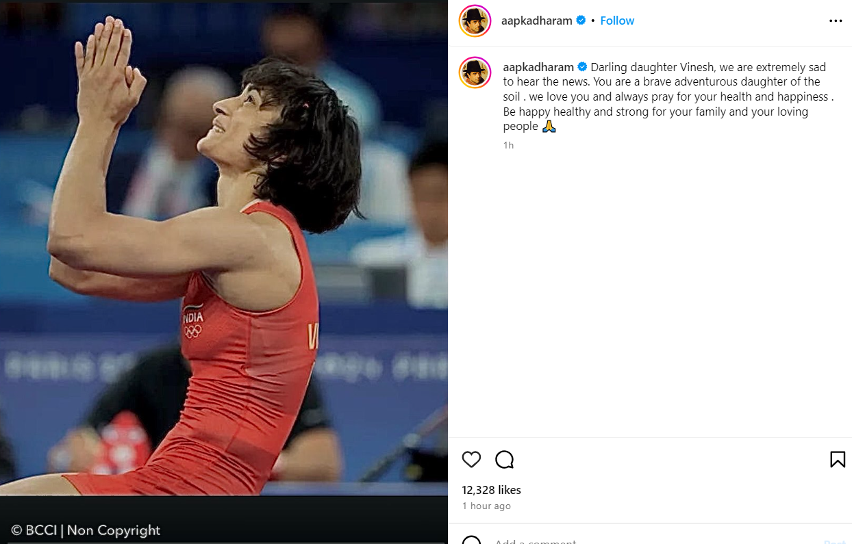 भारतीय पहलवान विनेश फोगाट को पेरिस ओलंपिक 2024 से अयोग्य घोषित किया गया। ऐसे में भारत के हर नागरिक में आक्रोश और निराशा देखी जा रही है। खबर है कि विनेश का 100 ग्राम वजह ज्यादा हो गया था जिसके चलते उन्हें फाइनल मैच से बाहर किया गया। वहीं अब अभिनेता धर्मेंद्र ने इंस्टाग्राम पर एक पोस्ट शेयर किया है।