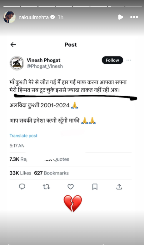 टीवी शो 'इश्कबाज' फेम नकुल मेहता ने अपनी आधिकारिक इंस्टाग्राम स्टोरी में विनेश फोगाट की पोस्ट टूटे हुए दिल की इमोजी के साथ शेयर की है।