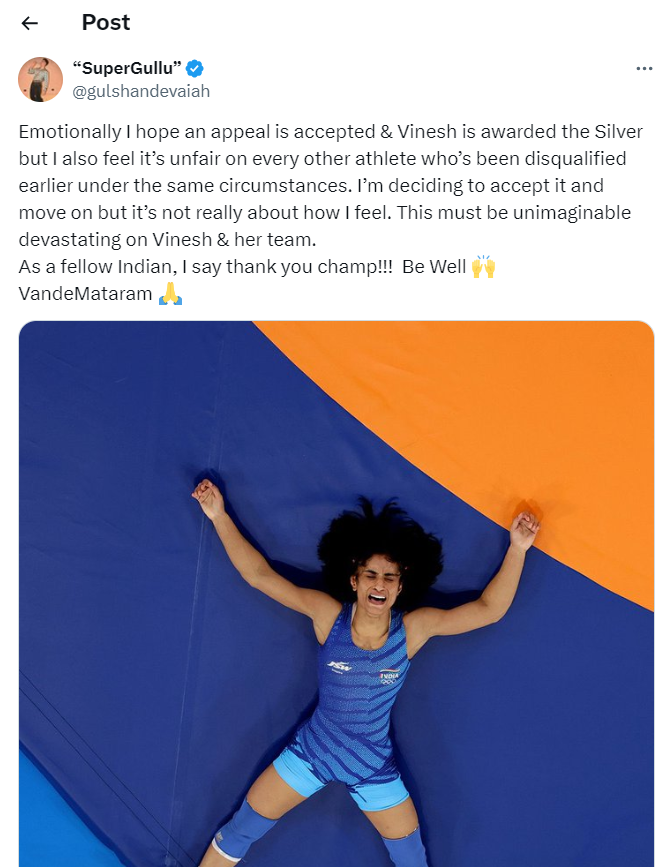 उलझ अभिनेता गुलशन देवैया ने ट्वीट करते हुए विनेश की फोटो शेयर की और कैप्शन में लिखा- भावनात्मक रूप से मुझे उम्मीद है कि अपील स्वीकार कर ली जाएगी और विनेश को रजत पदक से सम्मानित किया जाएगा, लेकिन मुझे यह भी लगता है कि यह हर दूसरे एथलीट के साथ अन्याय है, जिन्हें पहले इन्हीं परिस्थितियों में अयोग्य घोषित किया गया था।