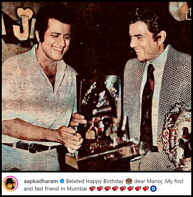 गुरुवार को उन्होंने इंस्टाग्राम पर मनोज कुमार के साथ अपनी एक फोटो साझा करके लिखा- प्यारे मनोज, जन्मदिन की विलम्बित बधाई। मुंबई में मेरा पहला और पक्का दोस्त।
