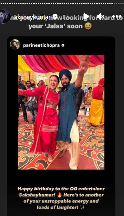 इस पोस्ट में परिणीति चोपड़ा का भी विश शामिल था, जो उन्होंने अक्षय को उनके जन्मदिन पर किया था। परिणीति ने अक्षय को बर्थडे विश करते हुए अपनी और अक्षय की आने वाली फिल्म 'मिशन रानीगंज' की एक तस्वीर शेयर की।