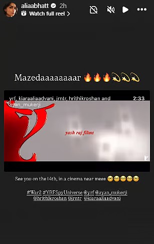 फिल्म 14 अगस्त को सिनेमाघरों में रिलीज होगी। आज फिल्म का ट्रेलर रिलीज हुआ और इसने आते ही तहलका मचा दिया। अयान मुखर्जी द्वारा निर्देशित यह फिल्म ड्रामा, रोमांस और देशभक्ति से भरपूर एक धमाकेदार फिल्म होने का वादा करती है। ट्रेलर रिलीज के बाद से कई सेलेब्स ने इसे अपनी इंस्टा स्टोरी पर शेयर कर इसकी तारीफ की और लोगों को बधाई दी। इनमें से एक आलिया भट्ट भी थीं। हालांकि आलिया ने अपनी स्टोरी में एक ऐसी बात लिखी जिसने फैंस का ध्यान खींचा।
