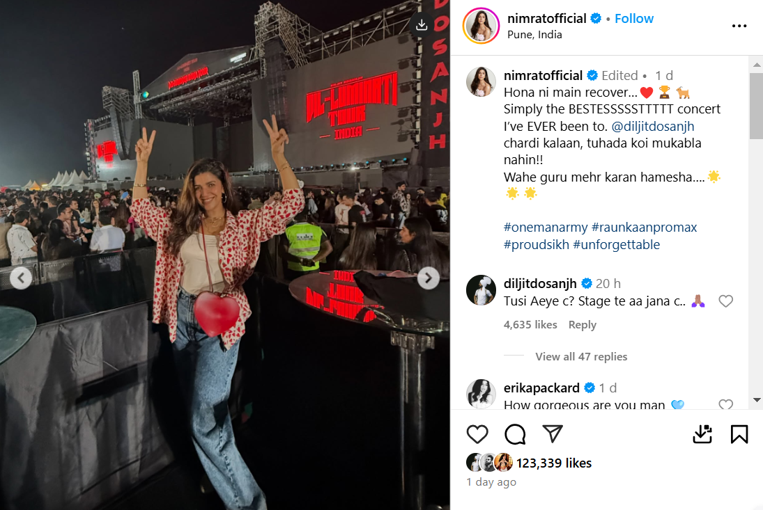 इसके बाद उन्होंने लिखा - 'अब तक का बेस्ट कंसर्ट जिसमें मैं गई हूं। तुम्हारा कोई मुकाबला नहीं है। वाहेगुरु तुम पर हमेशा मेहर करे।' वहीं दिलजीत ने जब निमरत का यह पोस्ट देखा तो उन्होंने भी इस पर रिएक्ट किया। दिलजीत ने निमरत से पंजाबी में सवाल किया कि आप कॉन्सर्ट में आए थे। आपको स्टेज पर आ जाना चाहिए थे।