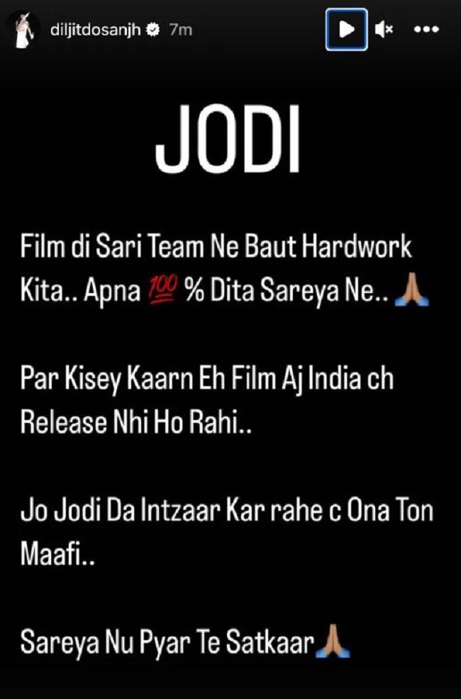 गौरतलब है कि पंजाब की एक स्थानीय अदालत में फिल्म की रिलीज पर रोक लगा दी है। दिलजीत दोसांझ ने पंजाबी में लिखा है, 'जोड़ी फिल्म की सारी टीम ने बहुत हार्ड वर्क किया था। अपना हंड्रेड परसेंट दिया था पर किसी कारण से यह फिल्म आज इंडिया में रिलीज नहीं हो रही है जो जोड़ी का इंतजार कर रहे हैं। उनसे मैं माफी मांगता हूं। सभी को ढेरों प्यार।'