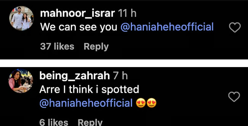 पहली तस्वीर में फैंस ने नोटिस किया कि हानिया नीरू के पीछे खड़ी हैं, उनके केवल छोटे बाल और आंखें दिखाई दे रही हैं। कई लोगों ने यह भी दावा किया कि दिलजीत एक अन्य तस्वीर में हानिया के साथ पोज़ दे रहे थे, जिसमें कथित तौर पर हानिया ने काली साड़ी पहनी हुई है। सिंगर ने उन्हें अपने पास पकड़ा हुआ है।