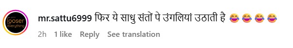 उनमें से एक यूजर ने कमेंट कर लिखा है- फिर ये साधु संतों पर उंगलिया उठाती हैं। दरअसल उस यूजर का ये कमेंट दिशा की बहन खुशबू पाटनी और कथावाचक अनिरुद्धाचार्य के विवाद की तरफ इशारा करता है।