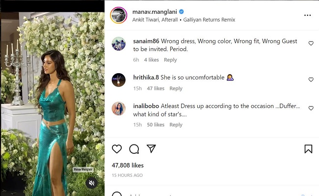 कई लोगों का ध्यान दिशा पाटनी की अनकम्फर्टेबल ड्रेस पर भी गया है। कई लोगों ने लिखा है, 'शादी के रिसेप्शन में ऐसी ड्रेस पहन कर क्यों आई है।' एक ने लिखा है, 'इन्होंने शादी के रिसेप्शन को स्विमवियर कैलेंडर लॉन्च समझ लिया।' एक ने लिखा है, 'वह शादी के रिसेप्शन में आई है या मेट गाला में।' एक ने लिखा है, 'यह कभी भी थाई दिखाये बिना नहीं रह सकती। यह बॉलीवुड की उर्फी है। कोई बड़ी बात नहीं टाइगर श्रॉफ ने उससे ब्रेकअप कर लिया।' एक ने लिखा है, 'अगर ड्रेस पहनकर अनकम्फर्टेबल रहो तो क्या मतलब है ड्रेस का?' एक ने लिखा है, 'यह बहुत अनकम्फर्टेबल है।' कई लोगों ने उन्हें डफर भी बताया है। एक ने लिखा है, 'डफर किस तरह की एक्ट्रेस है यह।'