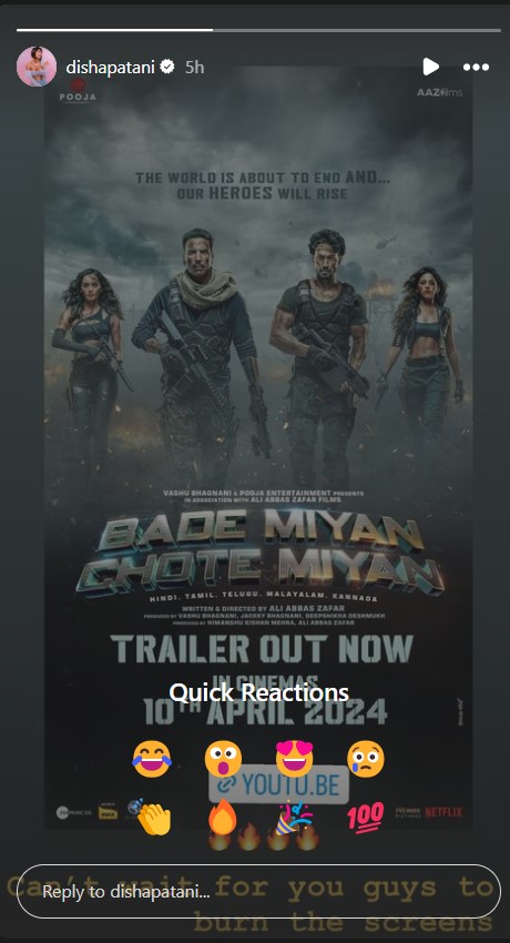'बड़े मियां छोटे मियां' के ट्रेलर लॉन्च के बाद दिशा पाटनी ने इंस्टाग्राम पर फिल्म का पोस्टर शेयर करते हुए एक्साइटमेंट जाहिर किया। एक्ट्रेस ने पोस्ट के साथ लिखा, "तुम लोगों को पर्दे पर आग लगाते हुए देखने का इंतजार नहीं कर सकती।"