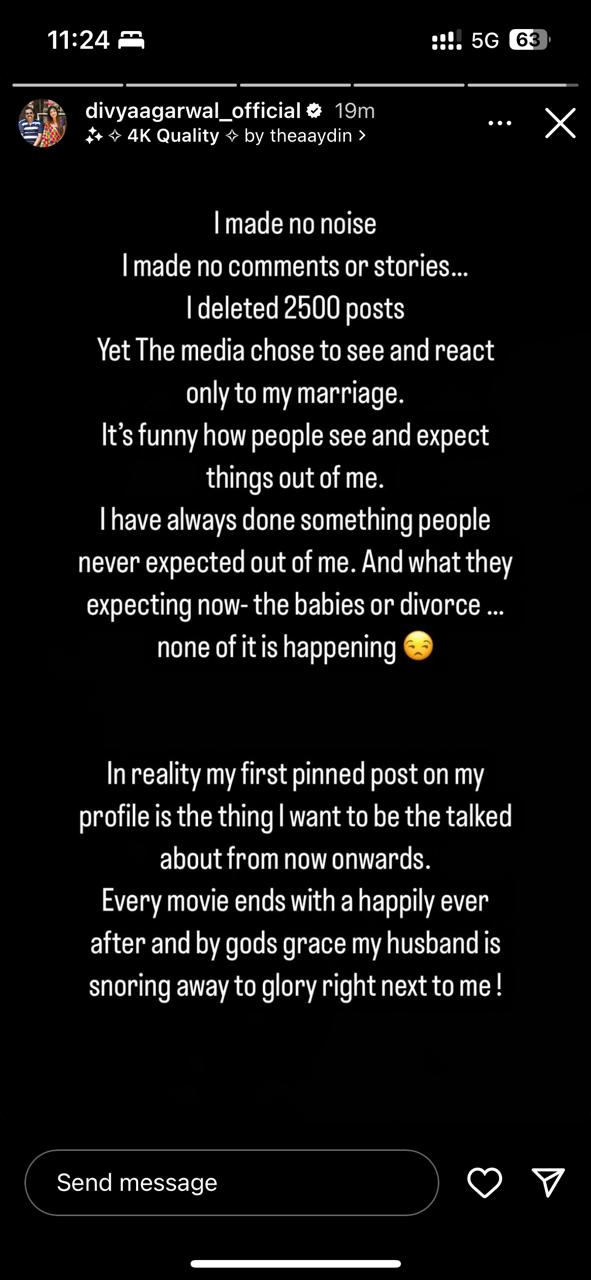 एक तरफ जहां टीवी एक्ट्रेस दलजीत कौर अपनी टूटती शादी को लेकर मीडिया में बनी हुई है। ऐसे में दिव्या की शादी की अनबन की खबरों ने फैंस को हैरान कर दिया था, लेकिन अब उन्होंने एक लंबा-चौड़ा नोट लिखकर बताया है कि आखिर क्यों तस्वीरों को सोशल मीडिया से हटाया है। दिव्या अग्रवाल ने लिखा, 'मैंने कोई हल्ला नहीं मचाया। मैंने कोई कमेंट नहीं किया और न कोई स्टोरी पोस्ट की।