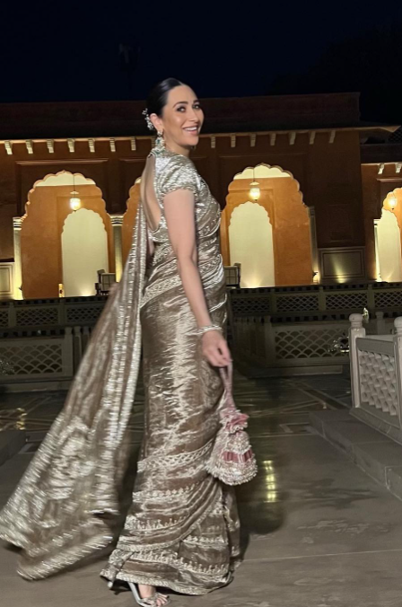 करिश्मा कपूर पहले की तरह ही आज भी अपनी आदाओं से लाखों लोगों का दिल जीत लेती हैं। मनीष मल्होत्रा की डिजाइन की हुई इस म्यूट गोल्ड में बुनी हुई टिश्यू साड़ी में करिश्मा बेहद सुंदर दिख रही हैं। दिवाली पर एथनिक पहनना का मन है, तो आप अपने वार्डरॉब में इसे शामिल करें।