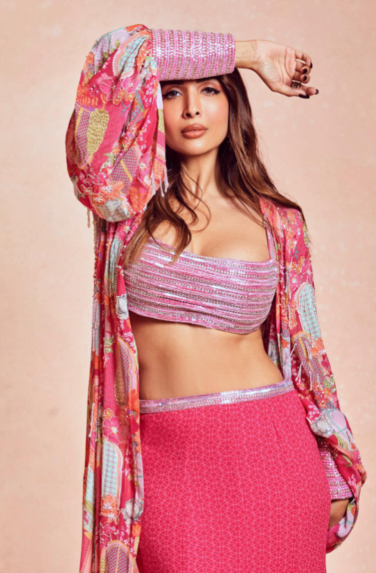दिवाली पर एथनिक लुक के लिए अगर आप कुछ खास कलेक्शन की तलाश में हैं, तो मलाइका के इस एथनिक लुक से इंस्पिरेशन ले सकती हैं। इस तरह के आउटफिट्स में आप बहुत ही खूबसूरत दिखेंगी। पिंक लॉन्ग स्कर्ट, शॉर्ट ब्लाउज और श्रग पहन कर मलाइका ने अपने लुक को खास टच दिया। आप भी दिवाली के लिए इस तरह का आउटफिट वार्डरॉब में शामिल कर सकती हैं।