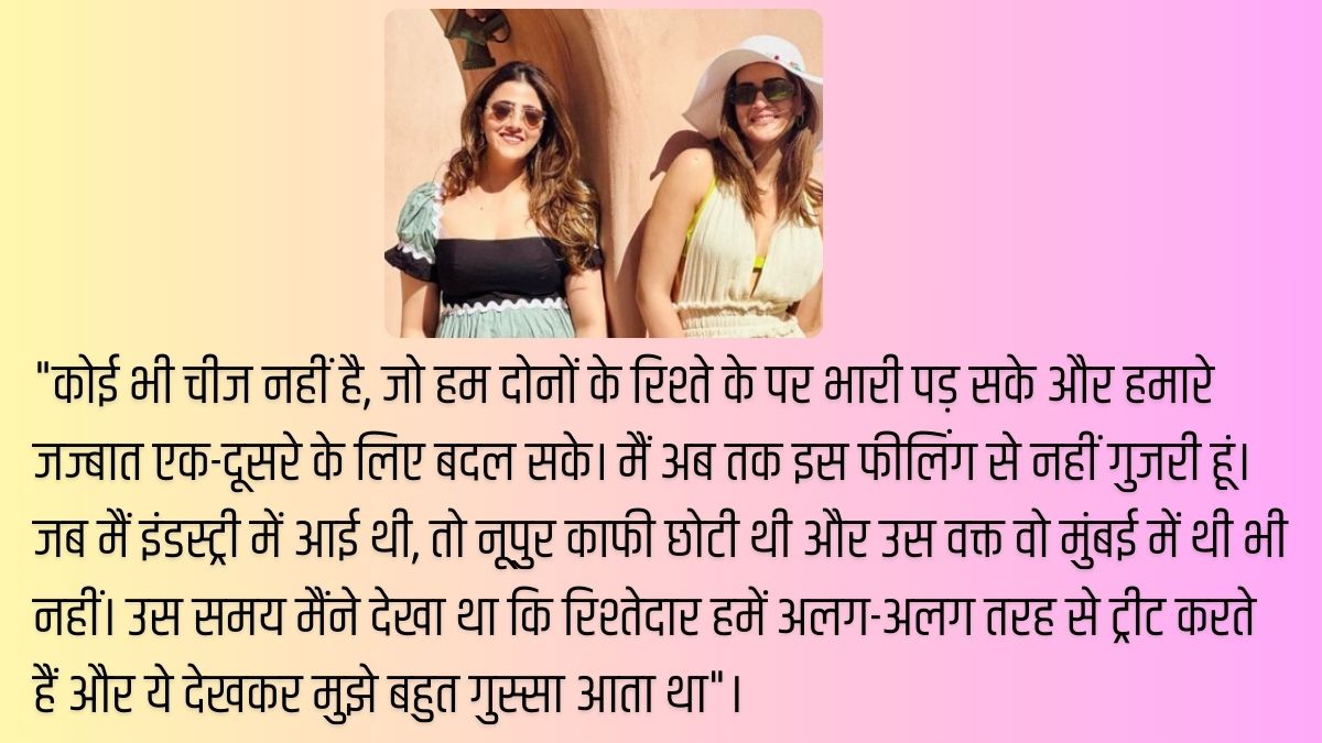 मुझे लगता है कि ये बहुत ही ज्यादा बचकाना बर्ताव है किसी की तरफ उनका। नूपुर मेरी छोटी बहन जरूर है, लेकिन वह बहुत ही मैच्योर और स्ट्रांग है। वह सभी चीजों को बहुत ही अच्छी तरह से हैंडल करती है। अगर उसे कोई चीज बुरी लग भी जाए, तो भी वह उसे कभी अपने चेहरे पर नहीं आने देती है"।