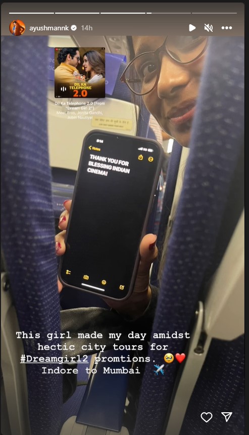 आयुष्मान खुराना ने इंस्टा स्टोरी में एक फ्लाइट की एक तस्वीर शेयर की है। फोटो में एक फीमेल फैन आयुष्मान को चुपके से अपना फोन दिखा रही है, जिस पर उसने एक्टर के लिए एक प्यार भरा मैसेज लिखते हुए कहा, भारतीय सिनेमा को अपना आशीर्वाद देने के लिए शुक्रिया।