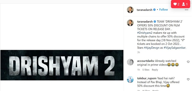 इस बारे में ट्वीट करते हुए फिल्म क्रिटिक तरण आदर्श ने कहा है, 'टीम दृश्यम 2 के निर्माता टिकट पर 50% की छूट दे रहे है। उन्होंने 2 अक्टूबर के दिन टिकट बुक करने पर यह छूट देने का निर्णय लिया है। यह फिल्म सिनेमाघरों में 18 नवंबर को रिलीज हो रही है। फिल्म में अजय देवगन विजय सालगांवकर की भूमिका में है।'