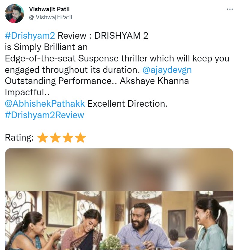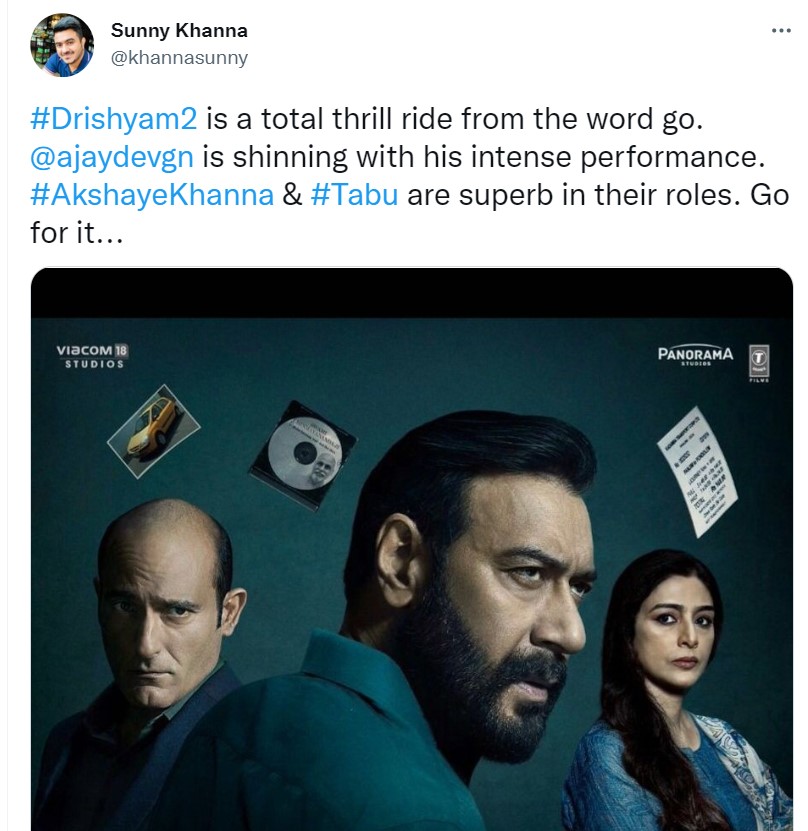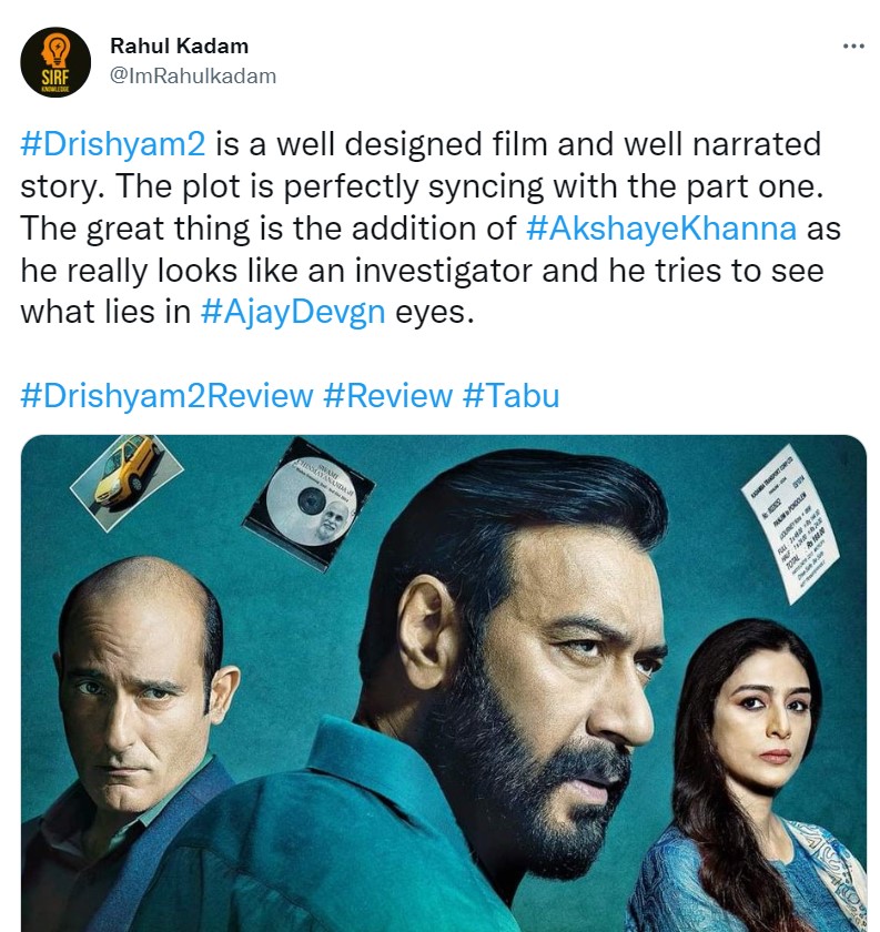 एक यूजर ने कहा, "दृश्यम 2 पूरी तरह से एक थ्रिल राइड है। अजय देवगन अपने इंटेंस किरदार में शाइन करते हैं। अक्षय खन्ना और तब्बू ने अपने रोल में कमाल का काम किया है। फिल्म देखने जरूर जाए।"