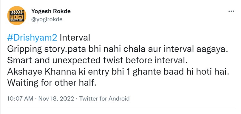 फिल्म के इंटरवल के बारे में बताते हुए एक अन्य यूजर ने कहा, "बांधे रखने वाली कहानी है। पता भी नहीं चला और इंटरवेल आ गया। स्मार्ट और एक्सपेक्टेड ट्विस्ट इंटरवल के पहले आ जाता है। अक्षय खन्ना की एंट्री भी एक घंटे बाद होती है। फिल्म के दूसरे हाफ का इंतजार जारी है।"