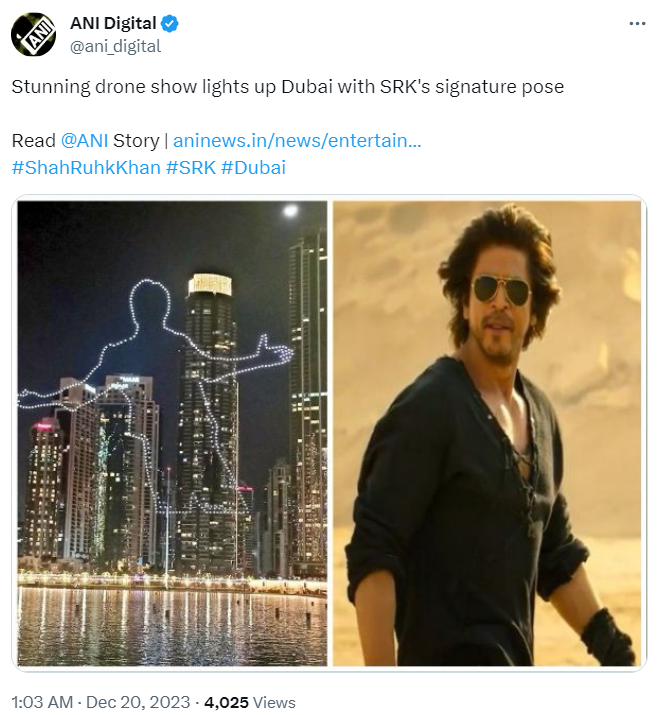 शो के दौरान कई ड्रोनों ने आसमान में रोशनी बिखेरा। अभिनेता के सिग्नेचर ओपन आर्म पोज के पैटर्न ड्रोन द्वारा आकाश में बनाए गए थे। डंकी के टाइटल और शाहरुख खान का नाम भी ड्रोनों के जरिये दिखाया गया। इस कार्यक्रम की कई तस्वीरें और वीडियो सोशल मीडिया पर वायरल हो गए। 'चक दे इंडिया' अभिनेता के फैन क्लब एसआरके यूनिवर्स ने भव्य कार्यक्रम से कई तस्वीरें और वीडियो साझा किए।