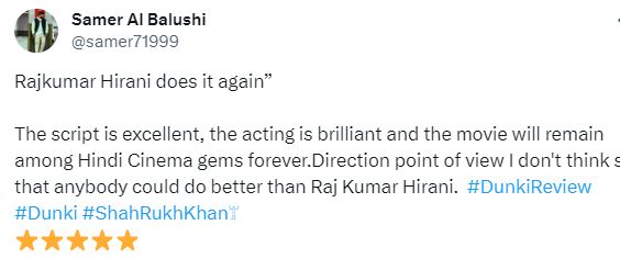 दूसरे यूजर ने डंकी देखकर अपनी प्रतिक्रिया जाहिर करते हुए लिखा, "राजकुमार हिरानी (Rajkumar Hirani) ने ये एक बार फिर से कर दिया। स्क्रिप्ट बहुत ही शानदार है और एक्टिंग लाजवाब है। इस फिल्म को हिंदी सिनेमा में हमेशा एक अच्छी फिल्म के तौर पर याद रखा जाएगा"।